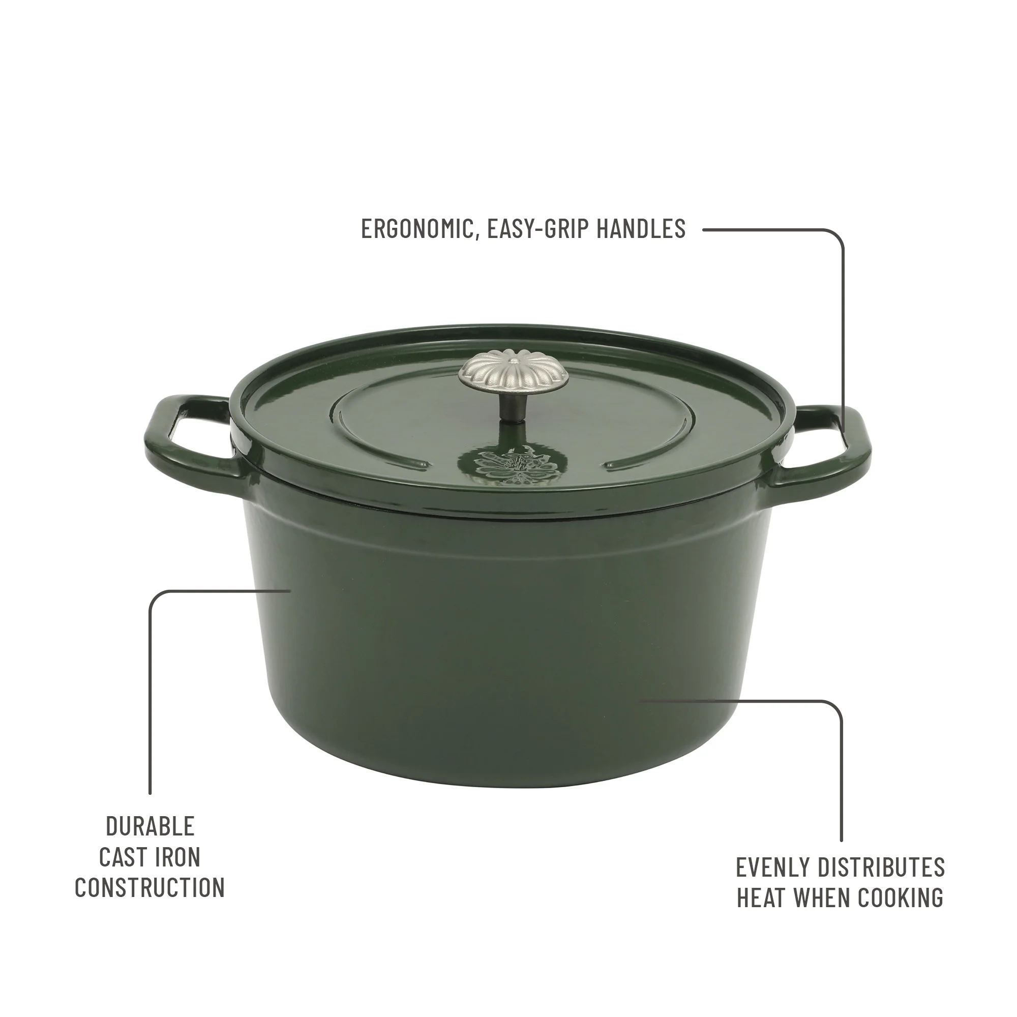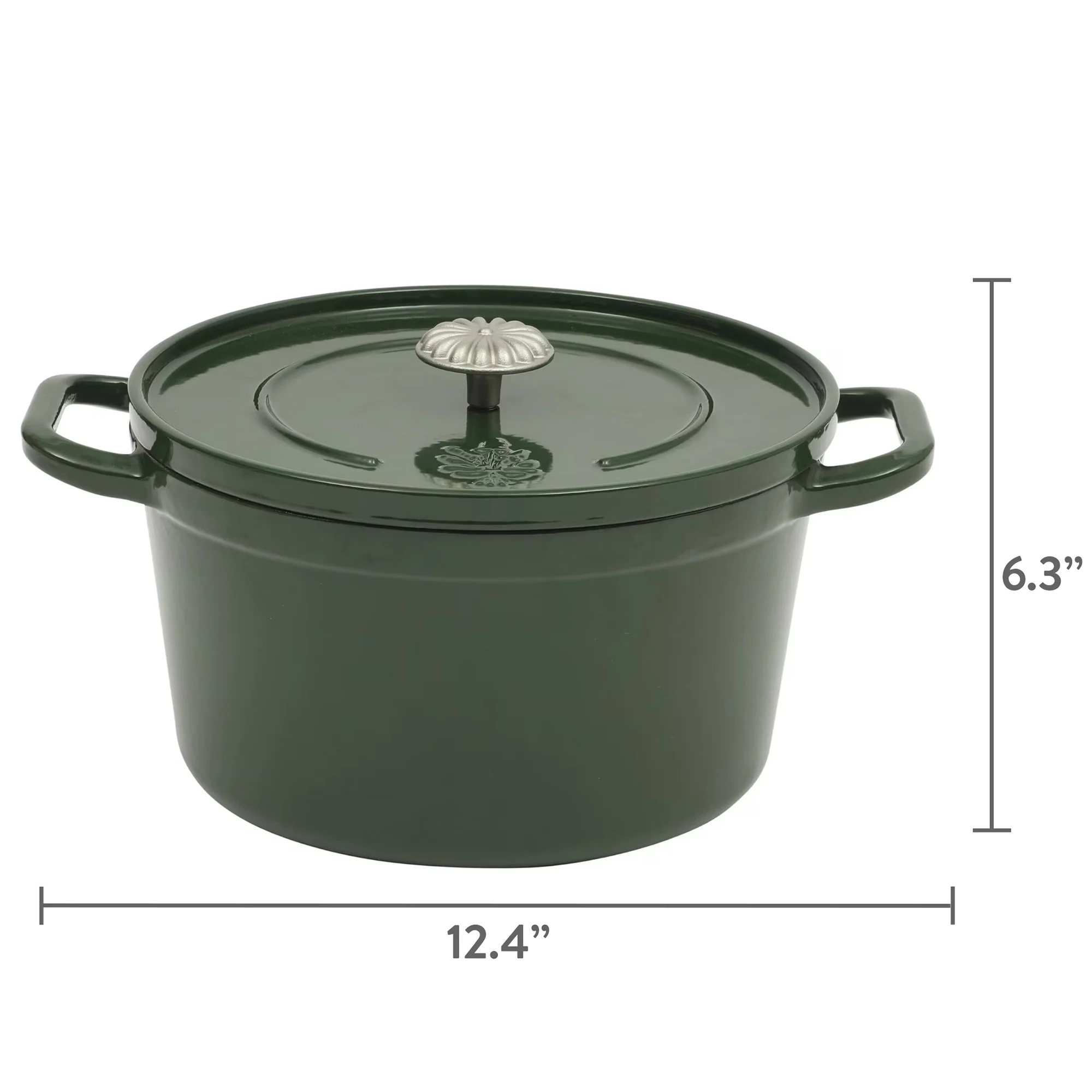 Durable Construction: Crafted from robust cast iron, this Dutch oven features a vibrant dark green enamel finish, ensuring both durability and an eye-catching appeal in your kitchen.